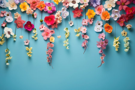 A beautiful hanging flower basket filled with vibrant blooms contrasts against a vivid blue wall, capturing the essence of nature and enhancing indoor decor.