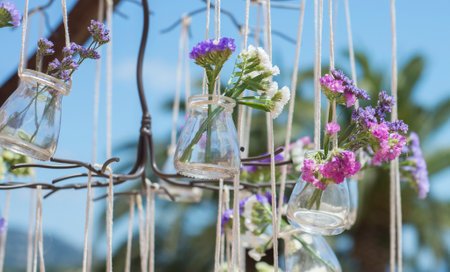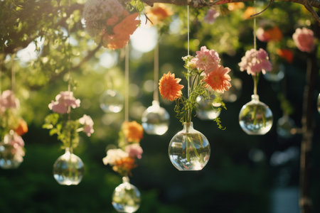 A dreamy image featuring blurred outdoor wedding floral decorations with flowers elegantly displayed in hanging glass flasks within a garden setting