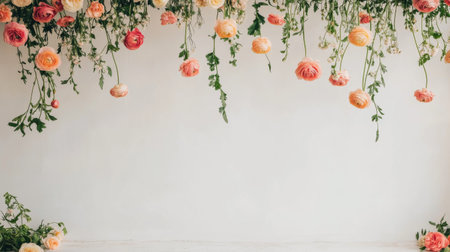 Beautifully arranged hanging roses of various shades create a vibrant floral display in a minimalist setting. The soft hues add warmth to the neutral background, enhancing the ambiance.