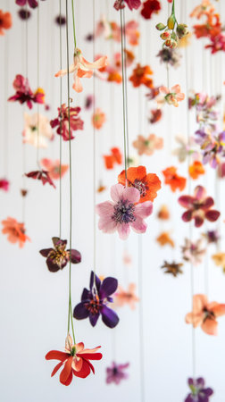 This stunning floral arrangement features a variety of colorful blooms hanging gracefully against a minimalist background, bringing a sense of elegance and beauty.