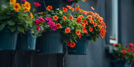Colorful hanging flower baskets adorn a balcony, creating a vibrant and cheerful outdoor decoration. High quality photo