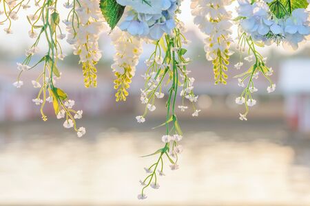 Artificial blue and white flowers decorate the arch as the backdrop in the wedding ceremony. Flowers background. Selective focus.