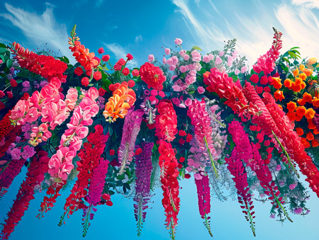 Discover the beauty of colorful hanging flower pots against a bright blue sky, creating a fresh and vibrant atmosphere perfect for seasonal decoration and outdoor inspiration.