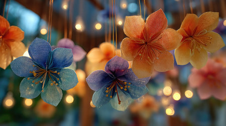 Charming fabric flowers suspended elegantly against a soft background filled with twinkling lights, creating a magical and festive atmosphere perfect for celebrations.