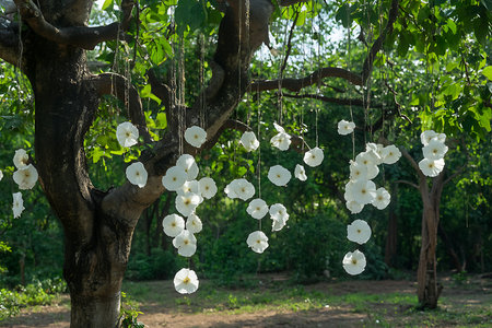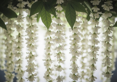 This stunning image captures the delicate beauty of white flowering plants hanging gracefully in nature, showcasing their serene charm and peaceful atmosphere.