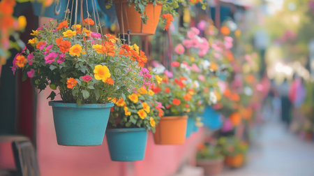 A picturesque scene featuring vibrant hanging flower pots overflowing with blooms, creating a cheerful atmosphere along a charming street, perfect for outdoor enjoyment.