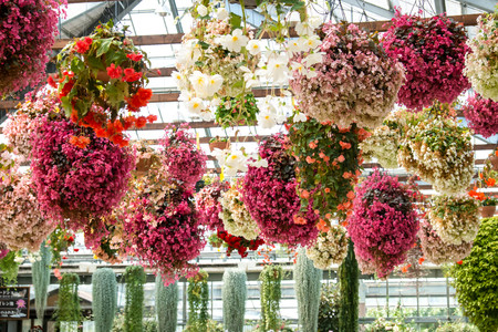 A stunning array of hanging flowers fills a greenhouse, showcasing a vibrant mix of colors and textures, bringing beauty to any garden setting with harmony and tranquility.