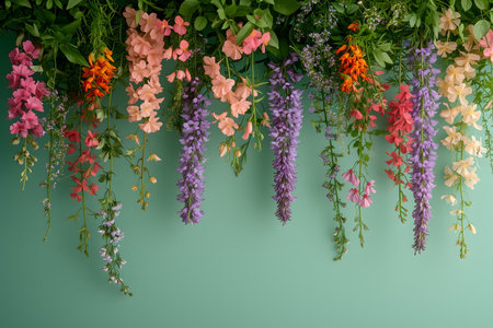 Colorful hanging flowers on pastel background, tranquil nature scene. Spring and floral beauty concept