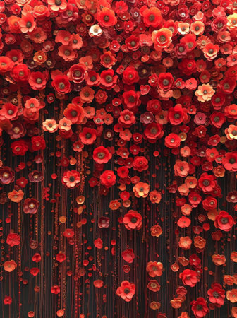 Vibrant Red Poppy Flowers Adorn the Ceiling of a Room Filled with Blooming Red Floral Arrangements