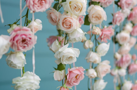 Hanging pastel flowers in soft focus, dreamy floral decor. Springtime and elegance concept