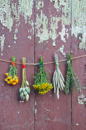 varions plants and medical herb bunch on old wooden cracked farm wall