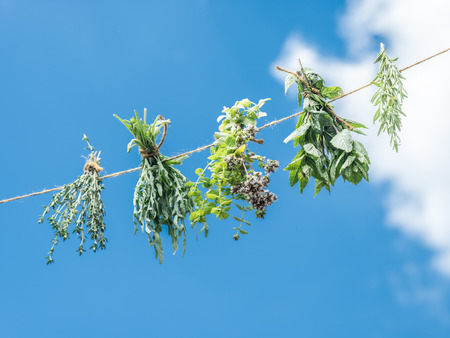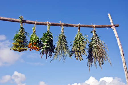 Bundles of flavoured herbs drying on the open air. Sky background.