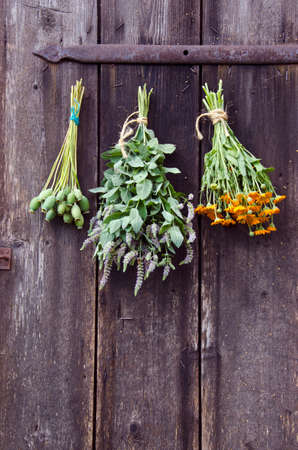 Bundles of medical herbs hanged on antique wooden ranch door