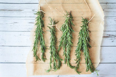 Flat lay of aromatic rosemary on parchment paper, styled on a white wooden background, ideal for cooking blogs, recipe books, and seasonal food preparation visuals