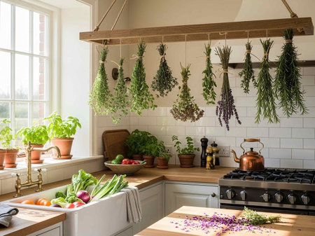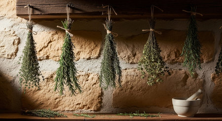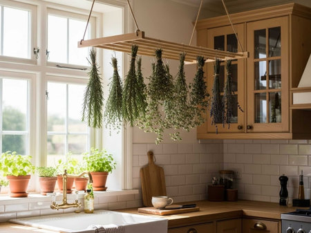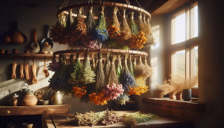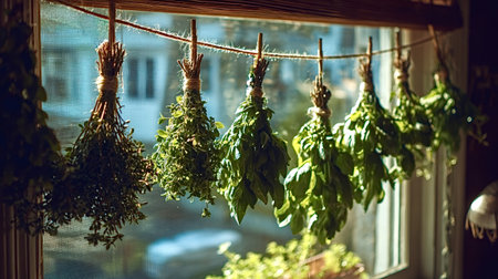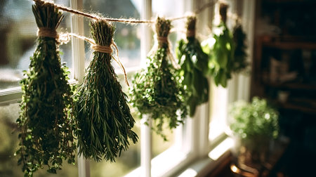 Bundles of basil, thyme and mixed aromatic herbs hang by a sunny kitchen window, gently drying to preserve flavor and fragrance for homemade, rustic cooking