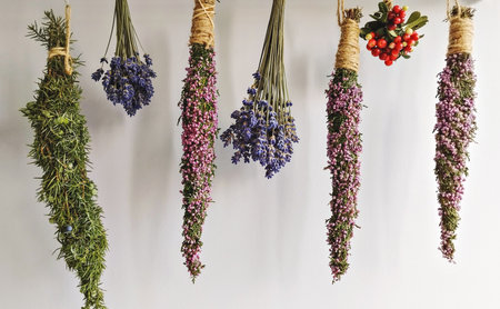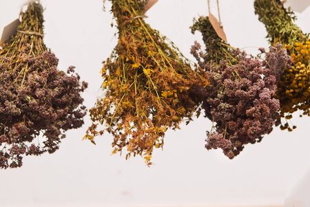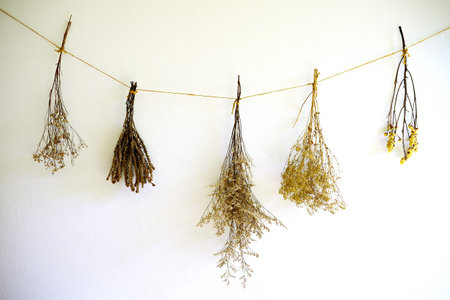 Drying herbs hanging on white wall. Close up of dried plants on white background.