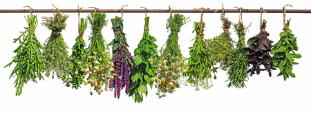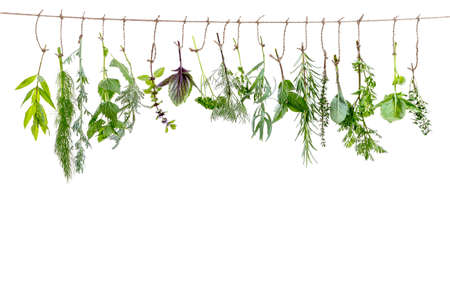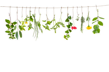 fresh flovouring and medicinal plants and herbs hanging on a string, on white backgroung