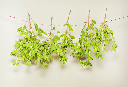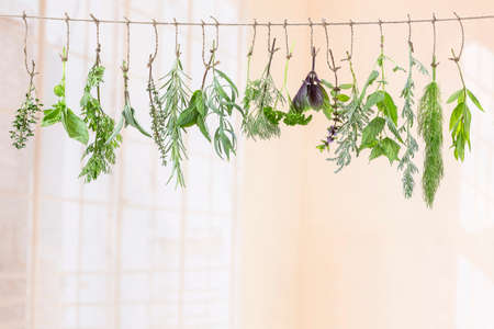 fresh flovouring and medicinal plants and herbs hanging on a string, on indoor backgroung