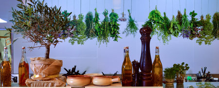 Bunches of different herbs in kitchen