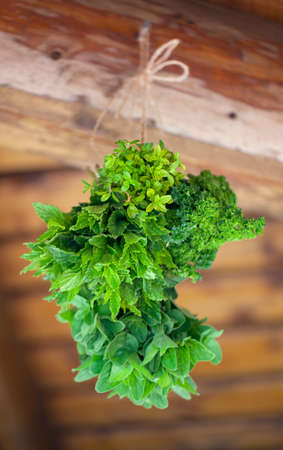 Heap of fresh herbs hanging on a wooden wall. Selective focus