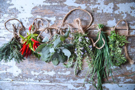 Fresh herbs hanging isolated on old wall background