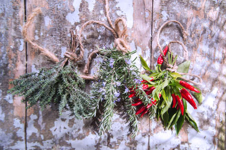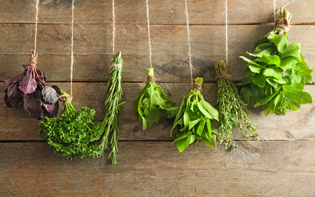 The bunches of herbs on wooden background.