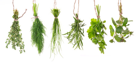Fresh herbs hanging on white background