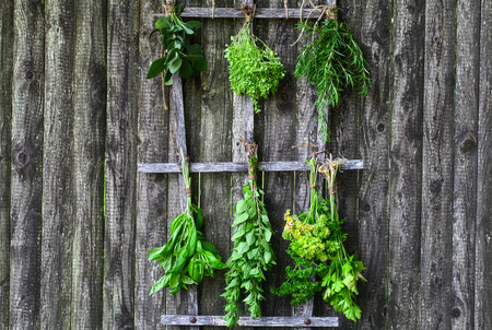 Set of herbs hanging and drying on a wooden fence