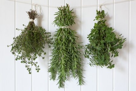 Bunches of fresh herbs hanging over white timber. Includes thyme, rosemary and oregano.