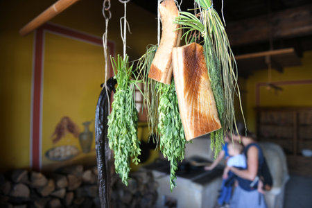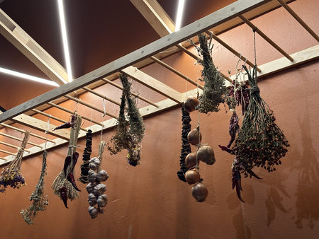 Warsaw, Poland - November 20, 2025: Dried herbs and vegetables are elegantly displayed on wooden rack, enhancing rustic kitchen ambiance for festive cooking