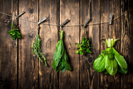 greens, spices or medicinal herbs on wood