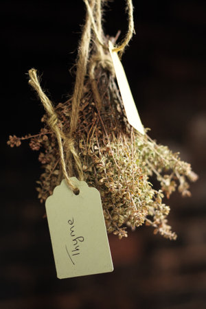 Dried thyme herb hangs in kitchen, trussed with garden string with label identifying plant