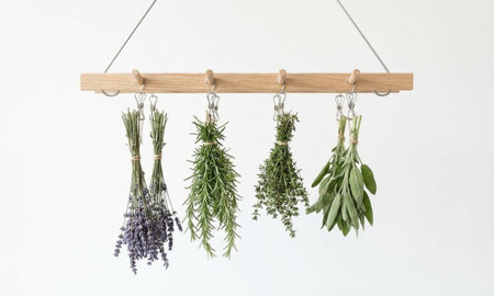 Herbs drying on wooden rod. Rosemary, thyme, lavender, and oregano bundles are shown.