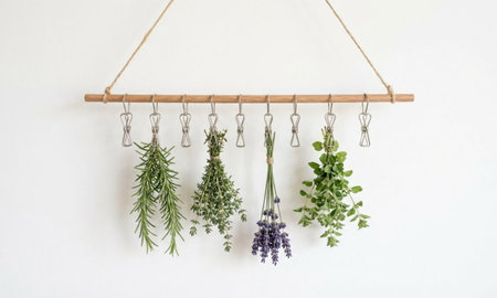 Bundles of smudge sticks suspended on hooks, herbs include lavender, rosemary and heather. , bundles form clean, organized row with natural materials and soft indoor light