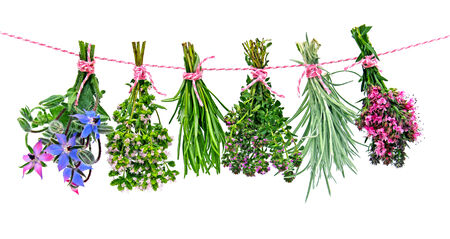 Fresh herbs hanging isolated on white background
