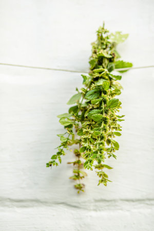 Lemon balm, Melissa officinalis, balm, common balm, or balm mint suspended for drying with an herbalist. Preparation of medicinal herbs for preparation of elixirs of alternative medicine. Ingredients for aromatherapy and herbal teas