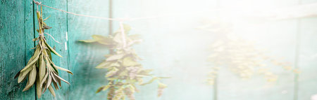 Different types of herbs dried in the shade on a rope against the blue sky. Shallow depth of field. Coloring and processing photo with soft focus