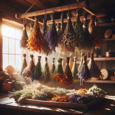 Bundles of yarrow, lavender, and st. John's wort drying on a bamboo stick, ready for traditional herbal remedies