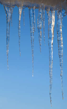 Icicles on blue background. Winter background with ice crystals.