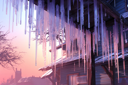 Beautiful huge icicles hanging from the roof of a house, glistening under the soft winter light. These natural ice formations create a stunning and magical winter scene, perfect for capturing the essence of the season.