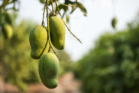 Group of green fresh mangoes on tree at tropical farm in summer, Agriculture fruit industry at harvest. Healthy diet eating lifestyle.
