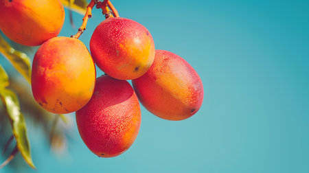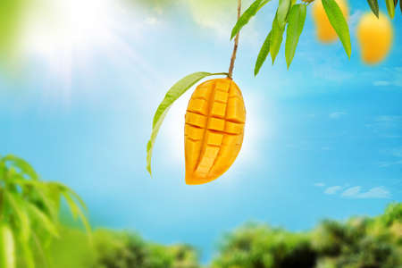 Slice of Mango tropical fruit hanging on tree with sunlight and blue sky background. Mango juice and dessert product concept.