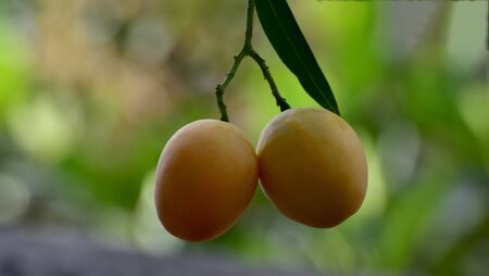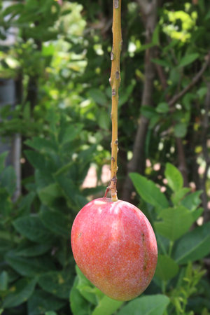 Fruits of mango on a branch of a tree with a blurred background, Vinales, Pinar del Rio, Cuba. Close-up