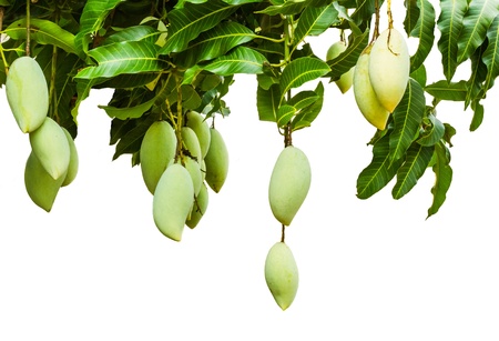A bunce of green sour and sweet mango hang on above 1 fit from land
