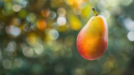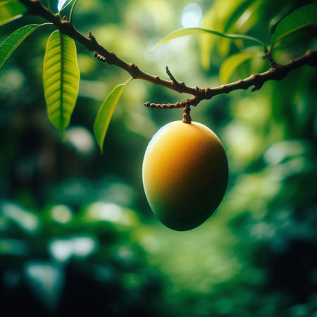 Single, perfectly ripe mango is showcased against a blurred backdrop of tropical foliage, emphasizing its rich orange hue and natural setting.