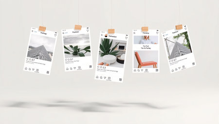 A minimalist and clean mockup featuring five white cards, representing social media posts or UI elements, hanging from strings with wooden clips against a light gray background. The cards display various images and content, suitable for showcasing design portfolios, app interfaces, or creative layouts.