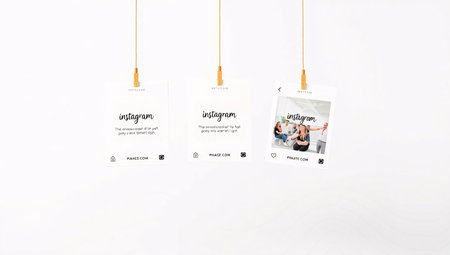 A minimalist mockup featuring three Instagram-style cards hanging from thin strings against a clean white background. The cards represent social media posts, with one displaying a photo and the others showing placeholder text, creating a clean presentation for design or branding purposes.