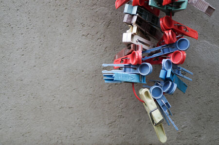 Damaged plastic clothespins hangind with grey background