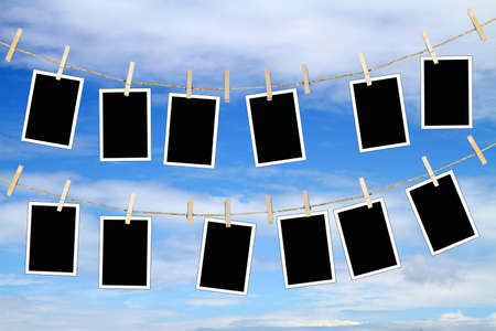 Several blank instant camera photo prints hanging on a rope or washing line isolated against a blue background. Space for copy.