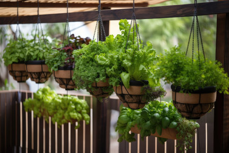 hydroponic garden, with herbs and vegetables growing in hanging baskets, created with generative ai